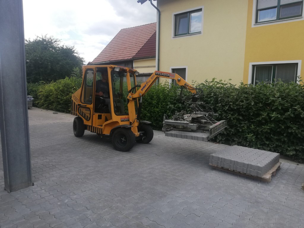 Unsere Verlegeeinheit (Fahrer + Maschine) nehmen dabei die Steinlage an der Pflasterpalette auf, transportiert diese zur Verlegekante und legt diese anschließend an der Kante in das Splittbett.